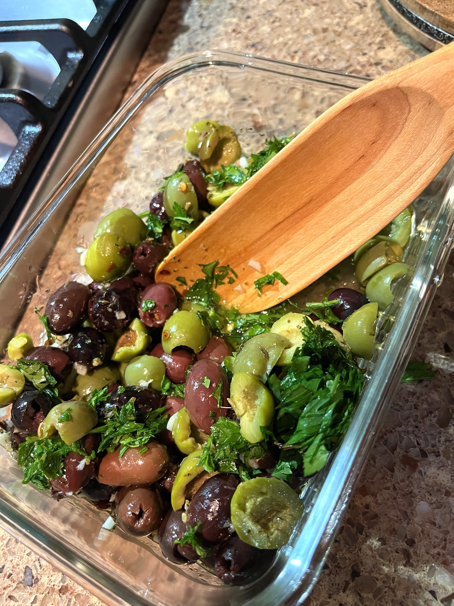 • Before serving, bring olives to room temperature and stir in fresh minced Italian parsley.