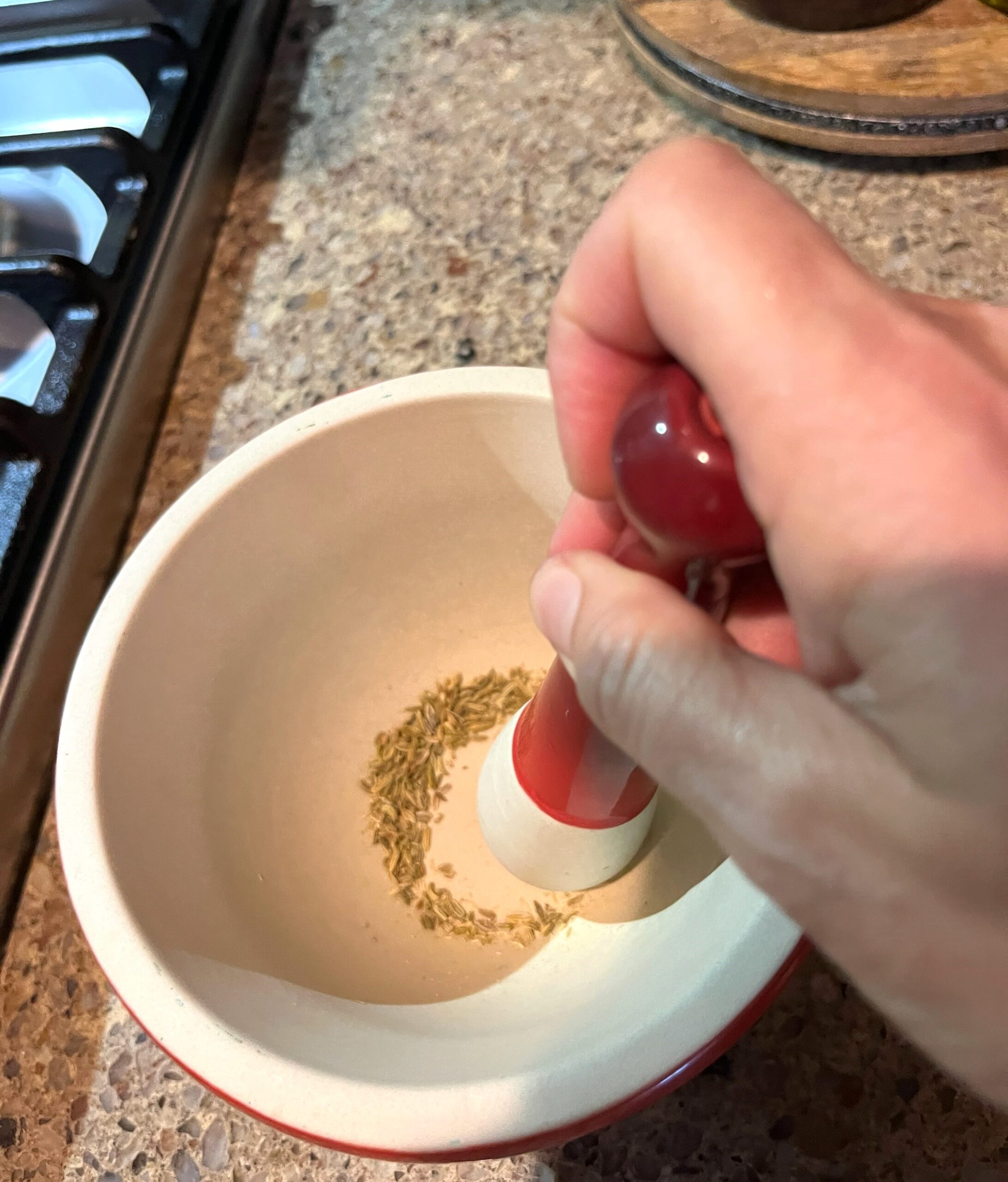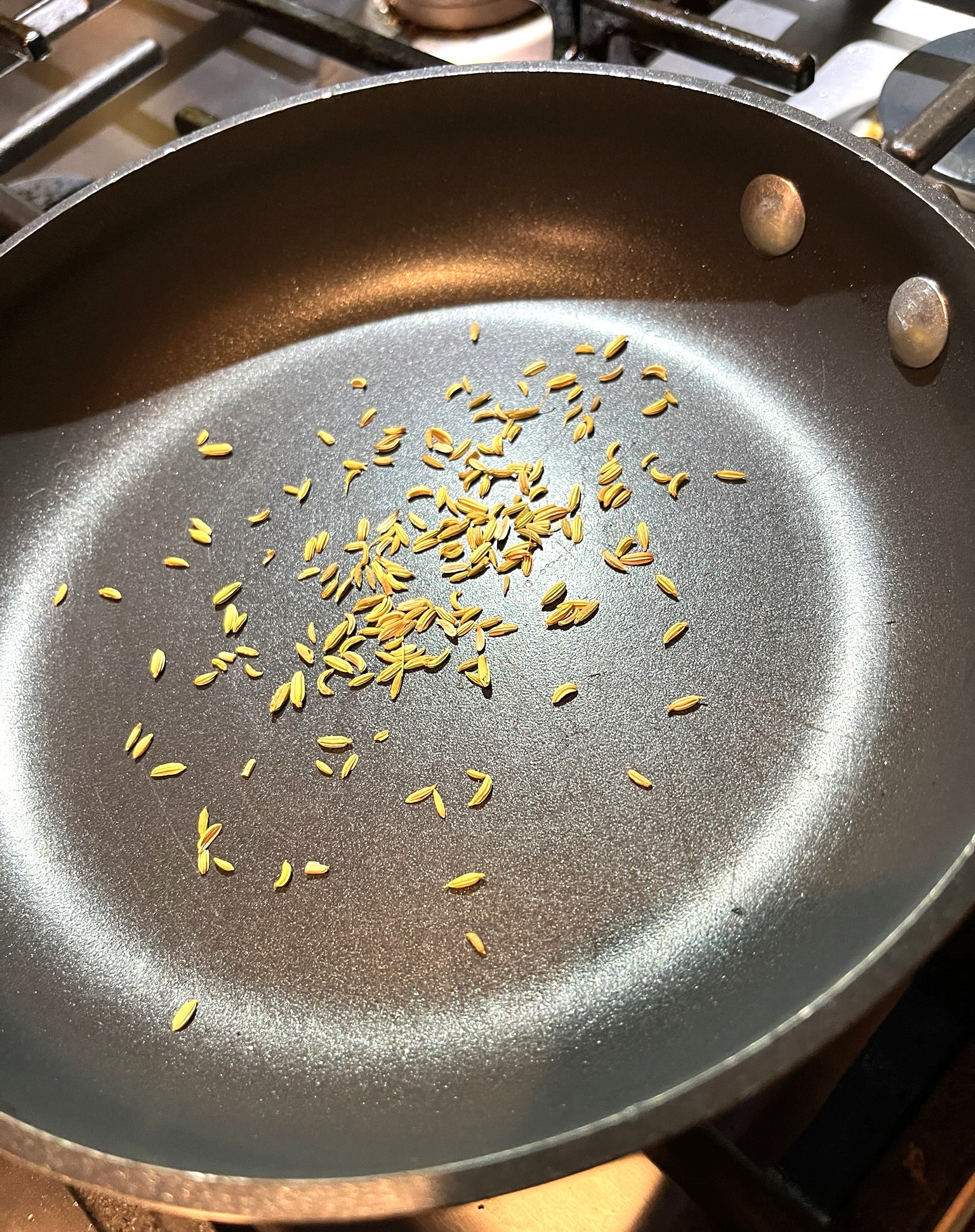 • In a small pan over medium heat, toast the fennel seed until aromatic. Transfer to a mortal and pestle. Gently grind to break up seeds..