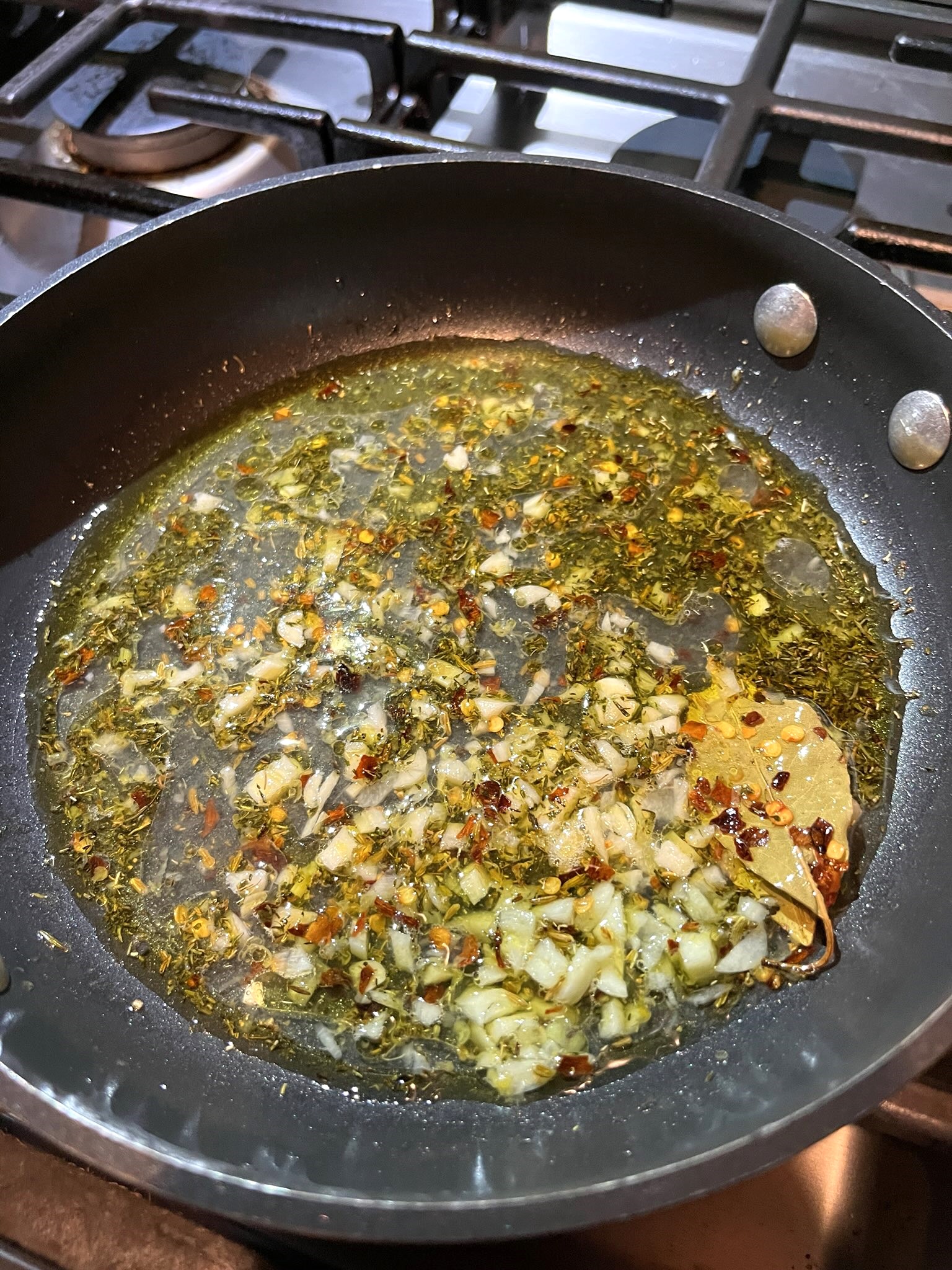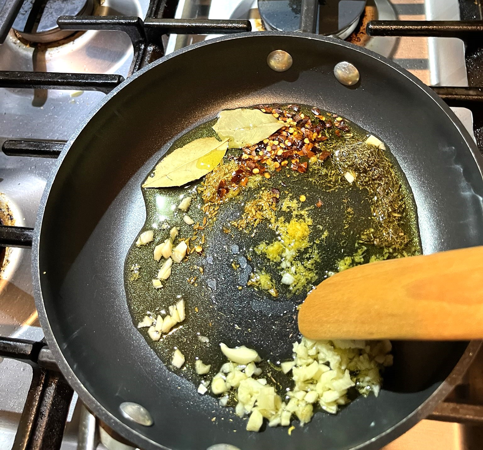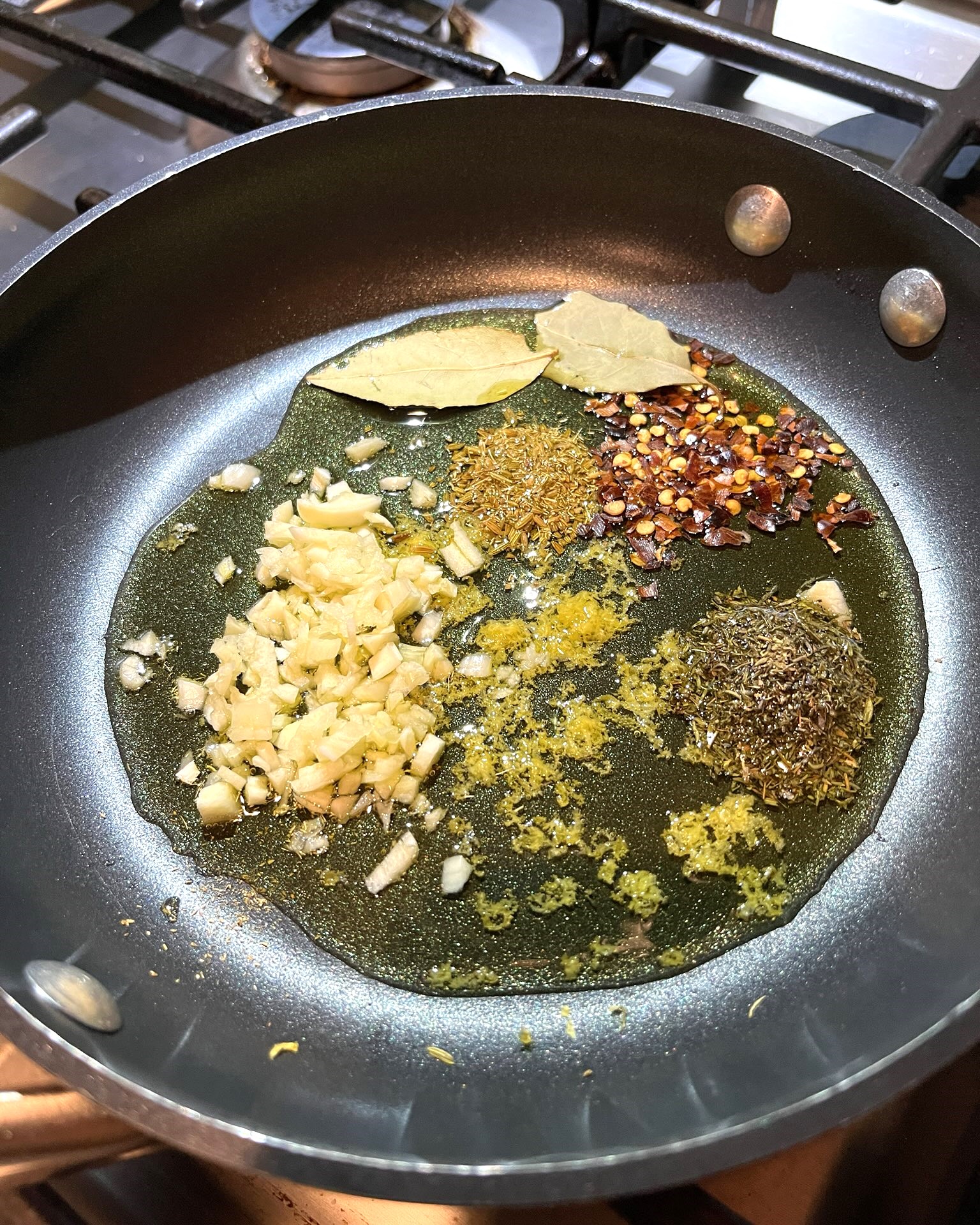 • Return pan to stove over low heat. Add olive oil, garlic, lemon zest, bay leaves, thyme, red chili pepper flakes, and prepared fennel seeds. Stir until warmed and well combined. Stir in lemon juice.