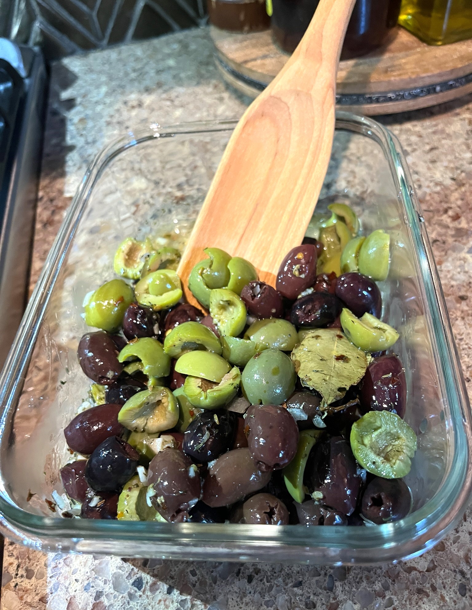 We totally love olives up in here, but The Husband, Son and Moi all find that store-bought olive salads are tres salty. And we don’t really dig that. Soooooo, I’ve been making marinated olives all summer long.